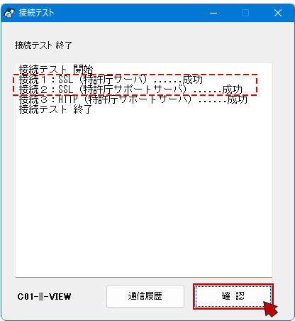 →「環境設定」の『通信』タブに戻ります。 - 「環境設定」の『通信』タブの〔接続テスト〕をクリックし、SSL接続が成功することを確認します。