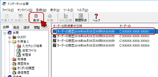 - 確認したいオーダーIDファイルを選択し、〔表示〕ボタンをクリックします。