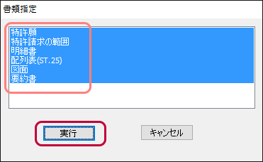 - 特許願や、意匠登録願のように、複数の書類で構成される書類を「送信ファイル」フォルダのリストより書類を選択して〔印刷〕した場合、「書類指定」画面がでます。「書類指定」画面で〔キャンセル〕すると印刷したことになりません。